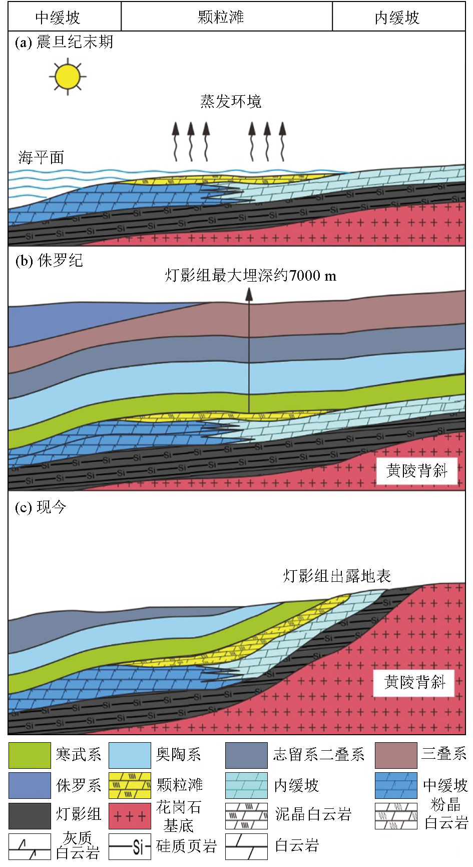| 图8 黄陵背斜周缘震旦系灯影组白云岩成因模式 a—震旦纪末期灯影组强烈蒸发条件下的高盐海水环境下,白云石迅速结晶生成低有序度的泥晶白云石;b—侏罗纪末期灯影组埋深达到最大,白云石经过深埋改造、重结晶作用形成高有序度的粉晶白云岩;c—抬升过程中灯影组出露地表,接受改造作用 |