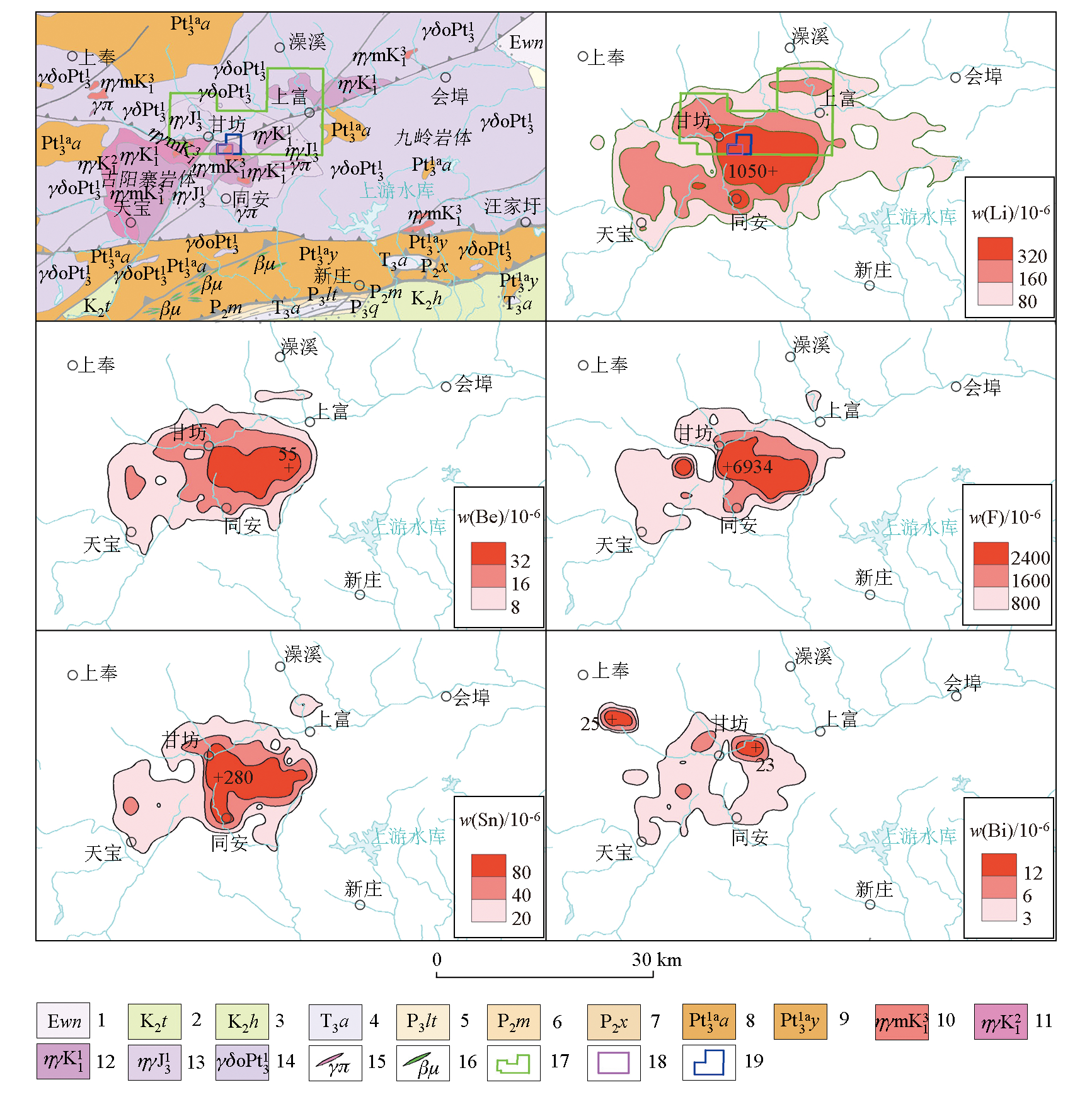 | 图2 甘坊1∶20万水系沉积物异常剖析 1—古近系武宁群;2—白垩系塘边组;3—白垩系河口组;4—三叠系安源组;5—二叠系龙潭组;6—二叠系茅口组;7—二叠系小江边组;8—青白口系安乐林组;9—青白口系宜丰组;10—早白垩世中细粒白云母二长花岗岩;11—早白垩世细粒白云母花岗岩;12—早白垩世中细粒二长花岗岩;13—晚侏罗世二云母二长花岗岩;14—新元古代黑云母英云闪长岩;15—花岗斑岩脉;16—辉绿岩脉;17—1∶5万水系沉积物测量范围;18—1∶1万土壤测量范围;19—普查区范围 |