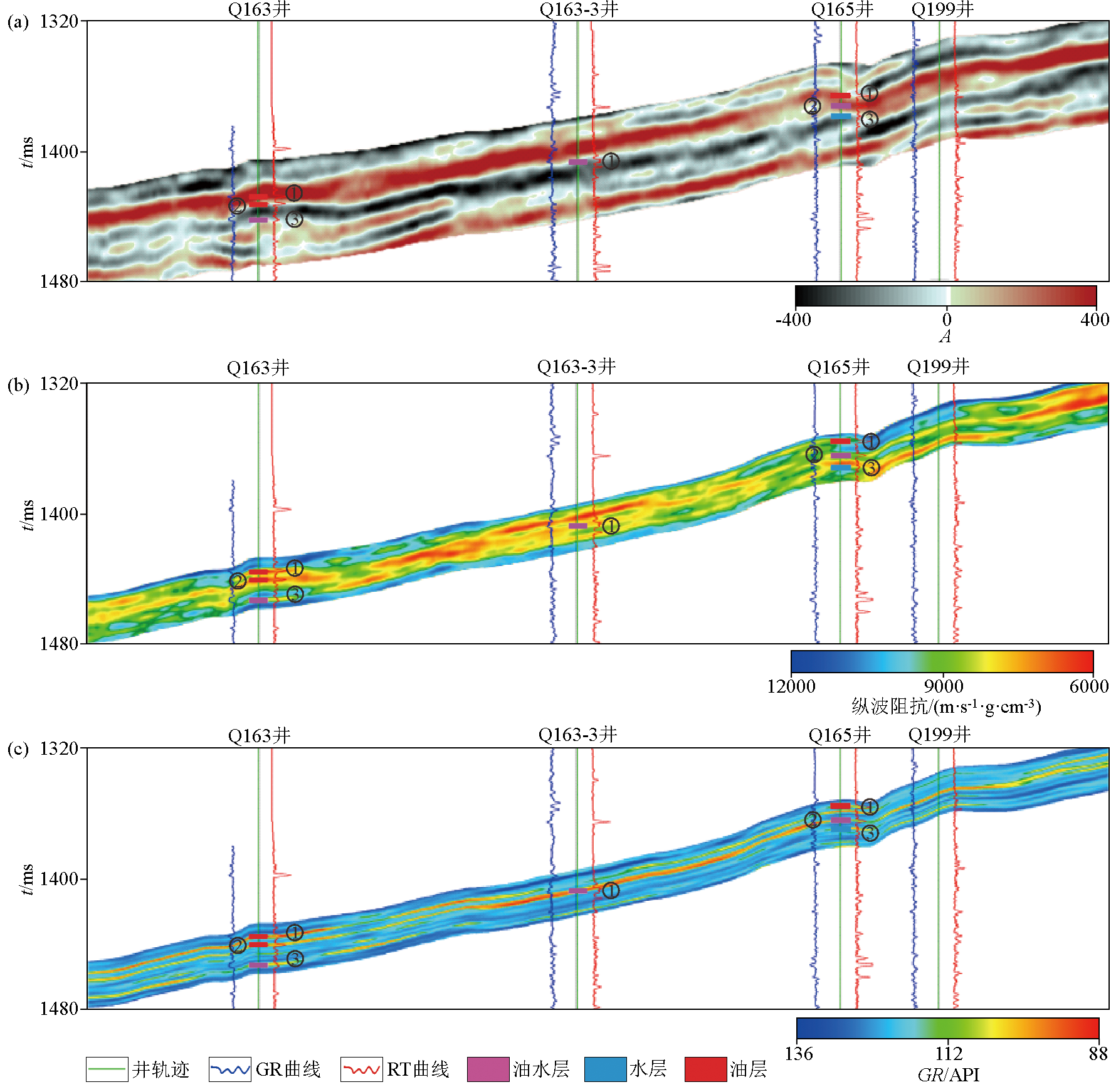 | 图6 过Q163—Q163-3—Q165—Q199连井的地震与反演剖面 a—地震剖面;b—稀疏脉冲反演纵波阻抗剖面;c—波形指示反演GR剖面 |