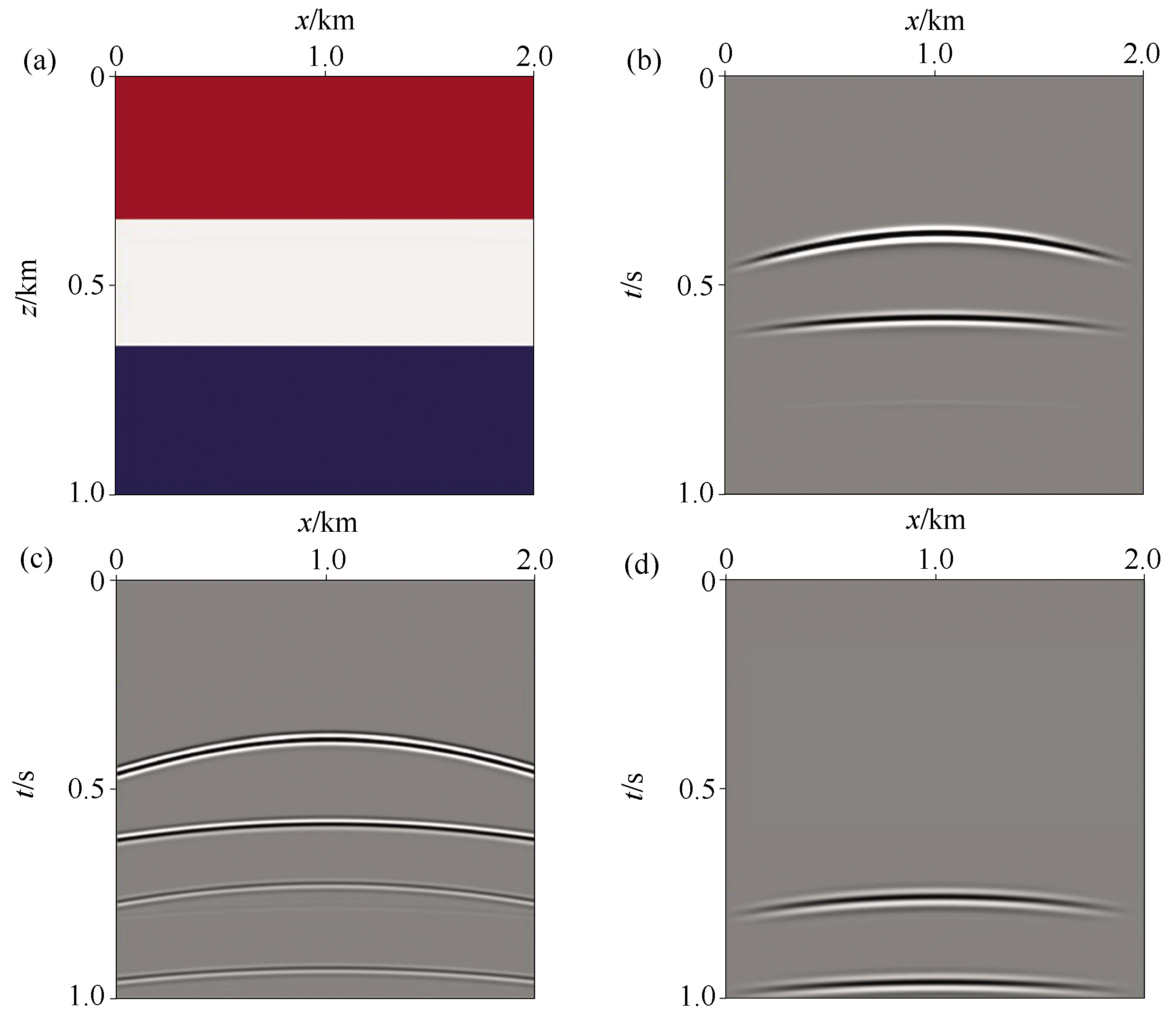 | Fig.4 Test results of layered model a—layered velocity model;b—primary shot record;c—original record;d—predicted multiples shot record |