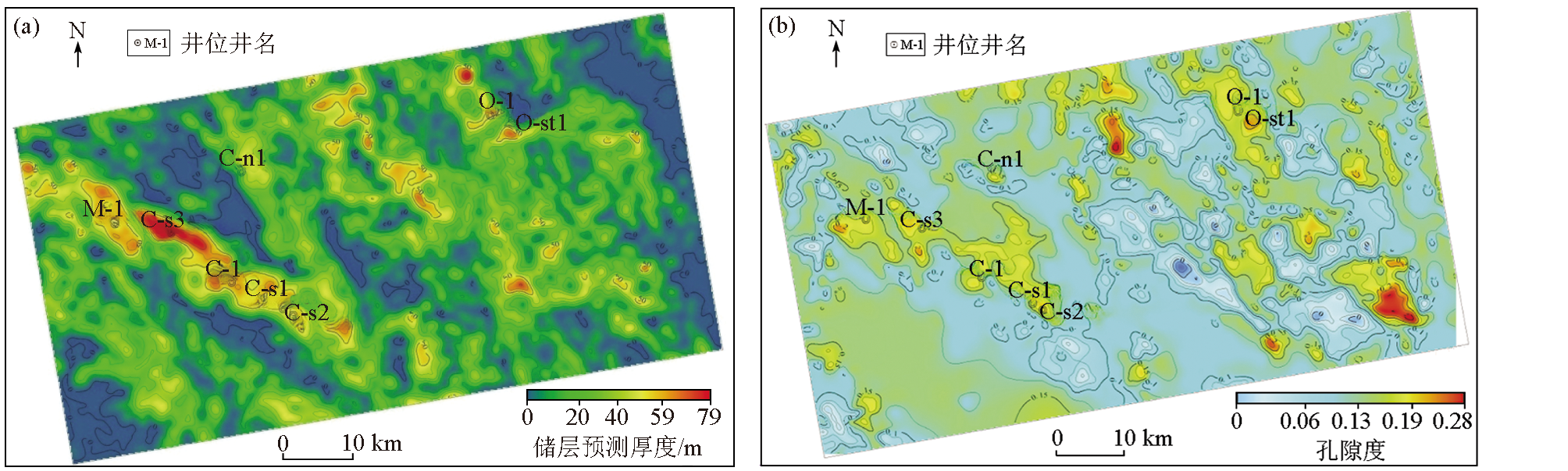 | 图6 基于射线弹性反演的fAVO-IMP浊积砂储层厚度预测(a)和孔隙度预测(b) |