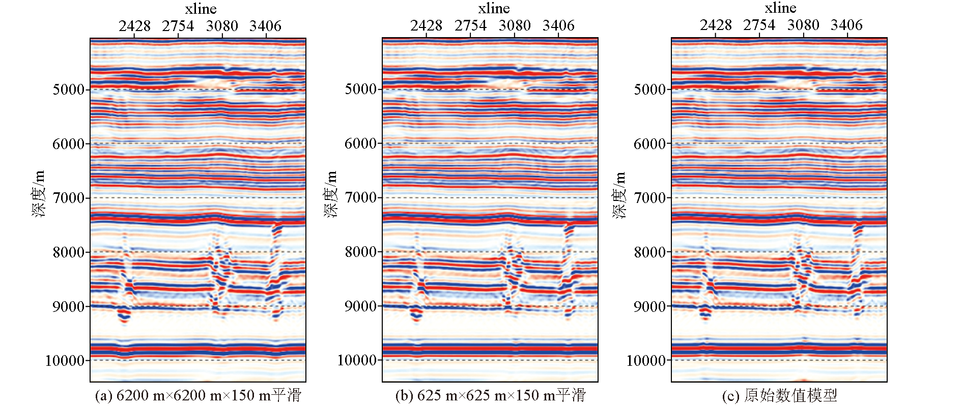 | 图3 不同尺度全局平滑速度模型对应的RTM成像剖面 |