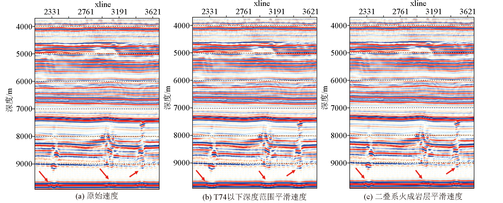 | 图5 不同层系平滑速度所对应的RTM成像剖面 |