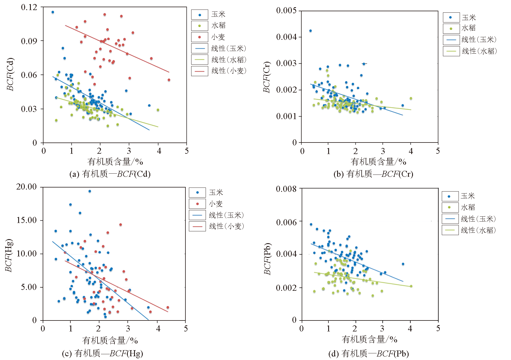 | 图4 农作物重金属富集系数同根系土有机质相关关系 |