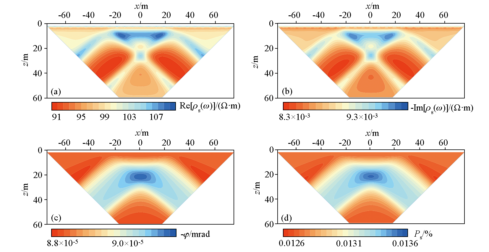 | 图10 模型4 Dipole-Dipole装置视复电阻率实部(a)、虚部(b)、相位(c) (f=1 Hz)及视频散率(d)等值线断面 |