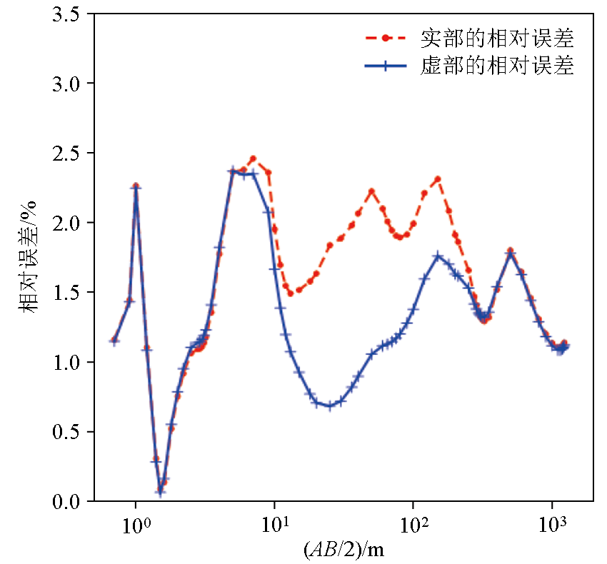 | Fig.2 The relative error of the apparent complex resistivity sounding curve by Schlumberger configuration |