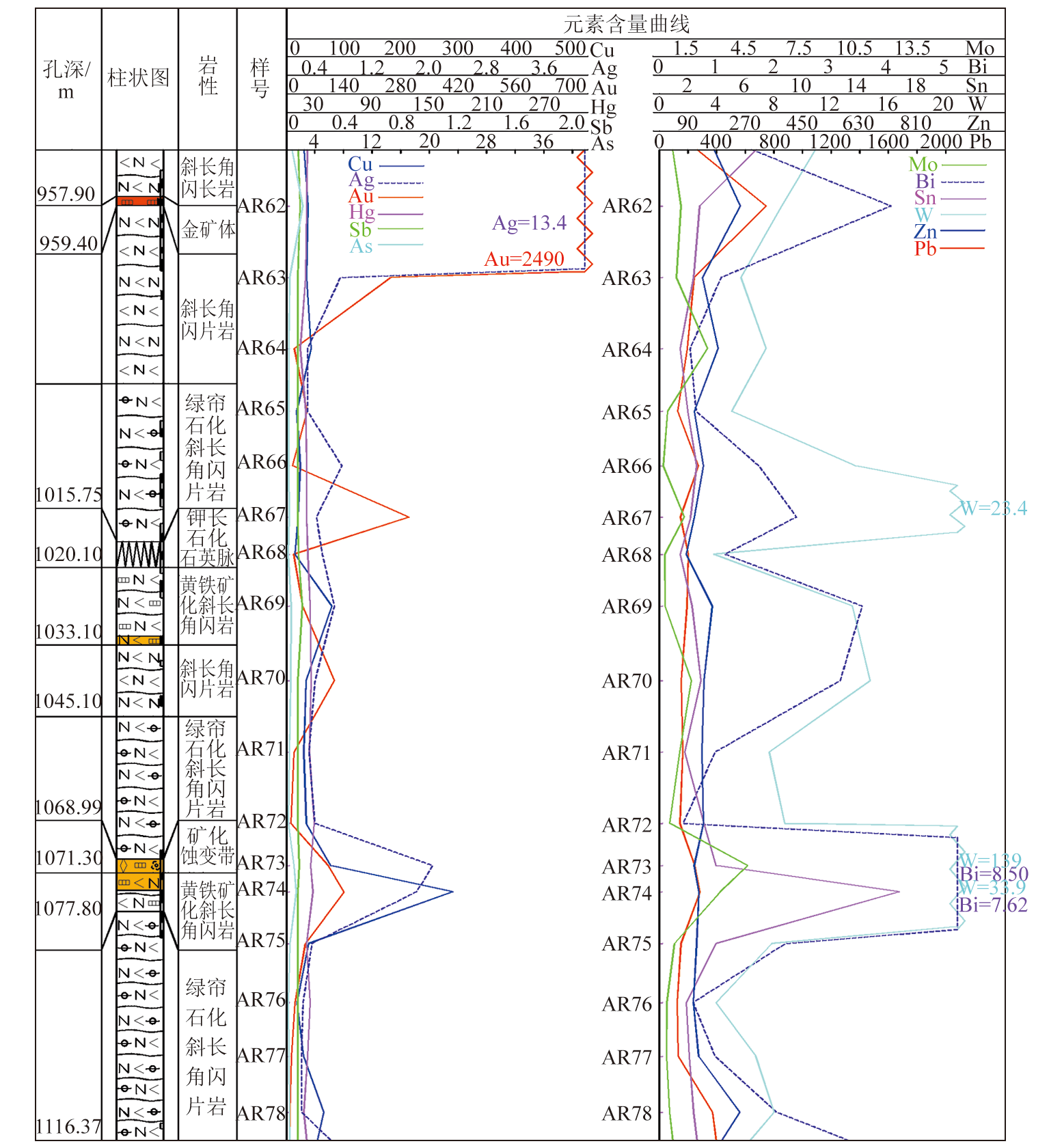 | 图11 钻孔ZKE3042综合柱状图 注:Au、Hg含量单位为10-9,其余元素含量单位为10-6 |