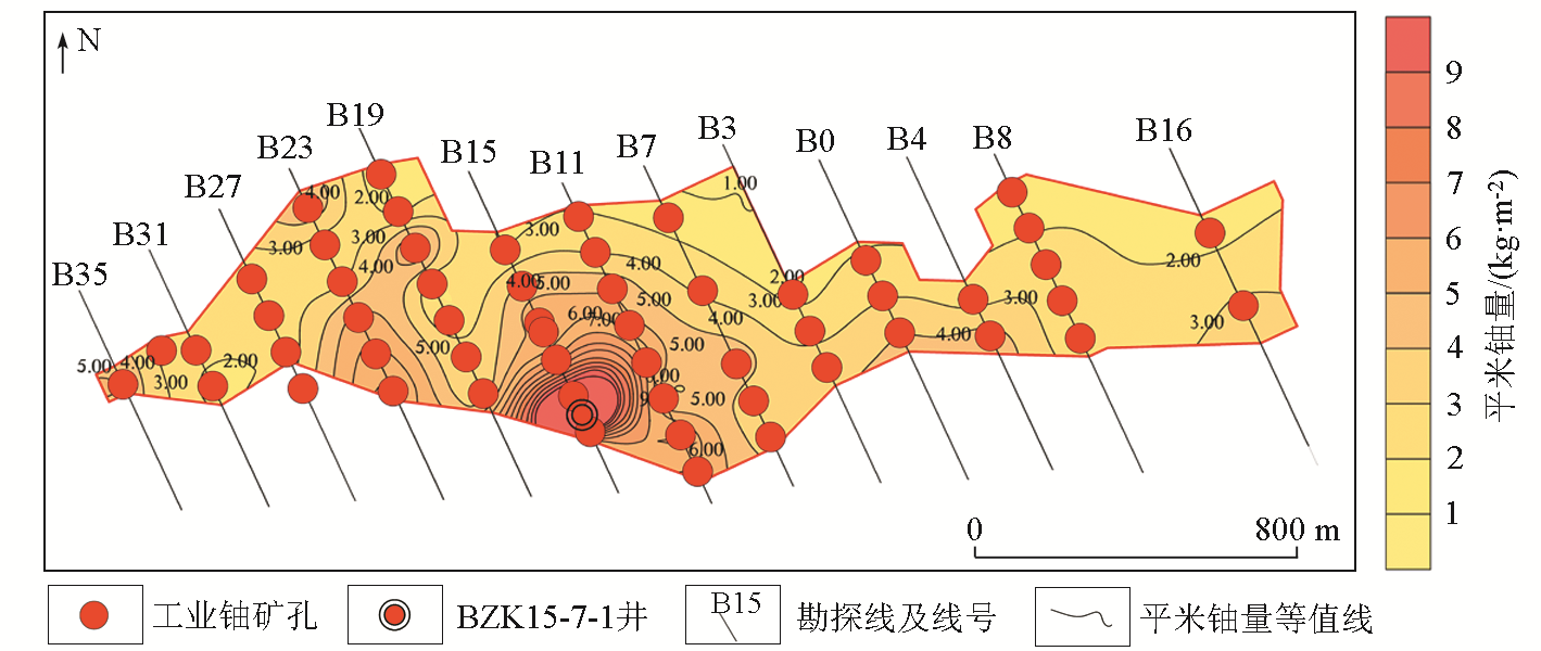 | Fig.10 Contour map of uranium content per square meter in the I-1 ore body of the Manglai uranium deposit |