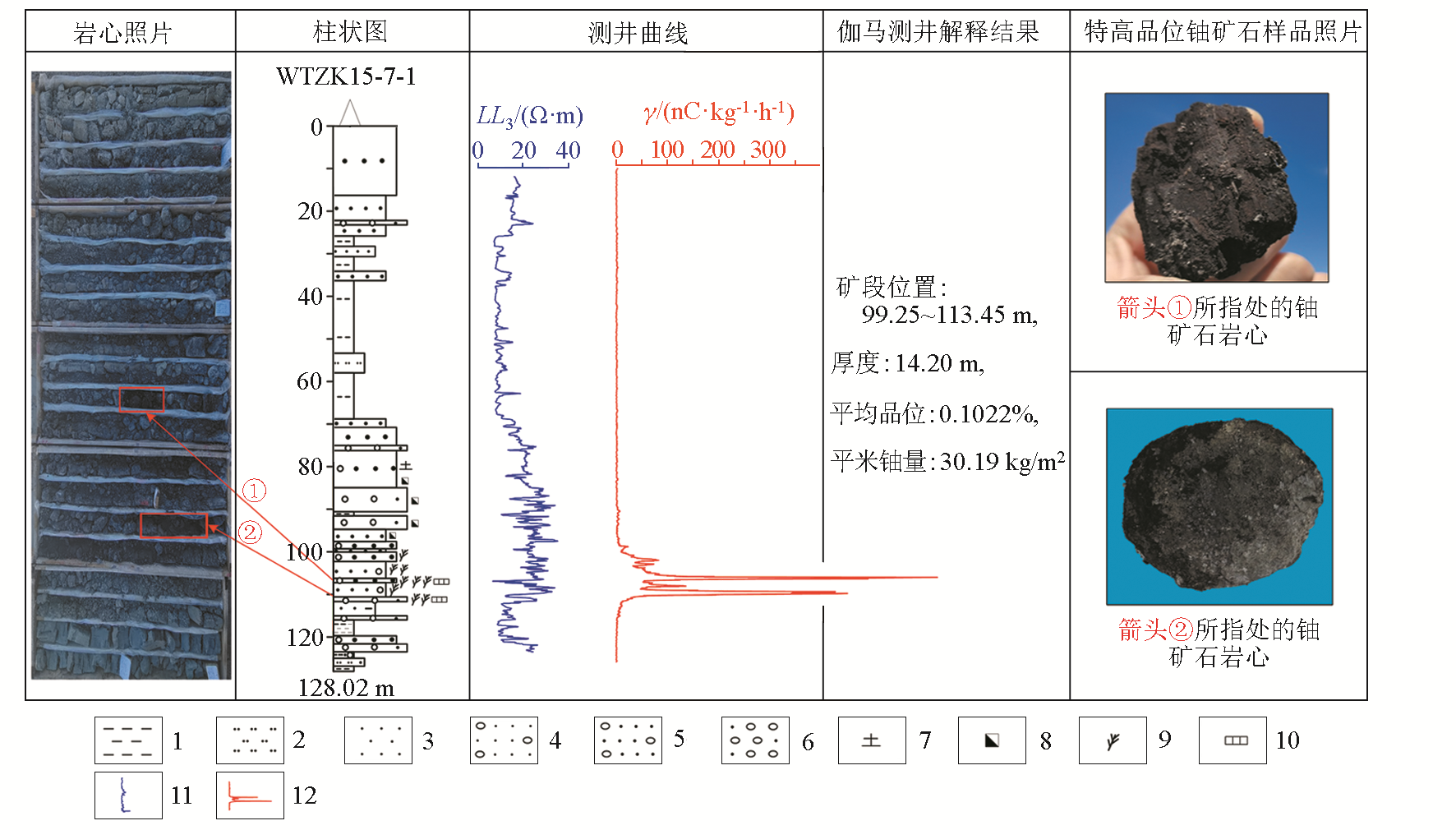 | Fig.11 WTZK15-7-1 histogram and schematic diagram of core photos 1—mudstone; 2—siltstone; 3—fine sandstone; 4—sandstone with gravel; 5—gravel bearing coarse sandstone; 6—sandy conglomerate; 7—kaolinization; 8—brown iron mineralization; 9—carbonized plant debris; 10—pyrite; 11—lateral resistivity logging curve; 12—quantitative gamma logging curve |