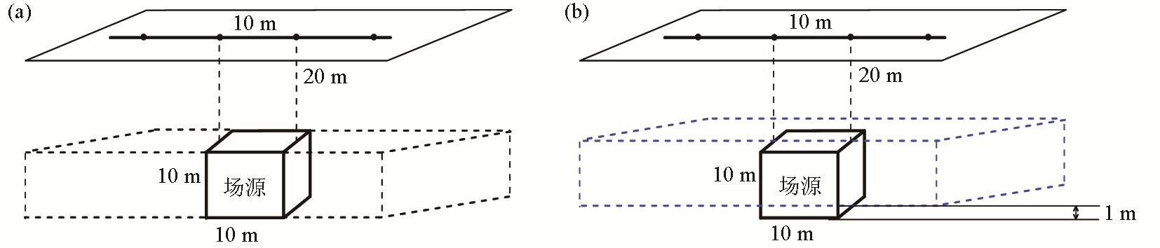 | 图1 单个棱柱体模型与等效源设置方式 a—等效源设置与实际场源一致的模型;b—等效源设置与实际场源存在偏差的模型 |
