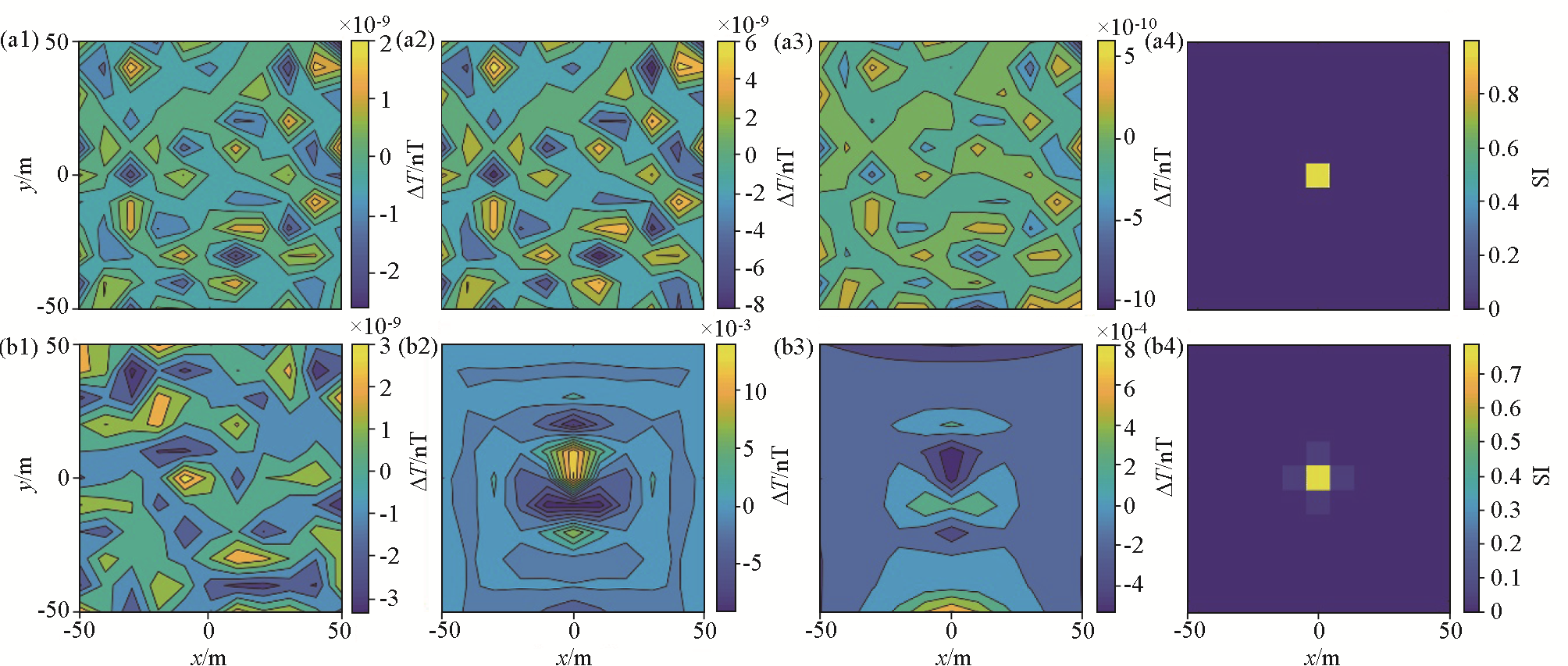 | 图2 基于模型一开展等效源等效性分析的结果 a—等效源位置与实际情况一致时的计算结果;b—上移1 m等效源的计算结果;a1、b1—与原始数据的拟合差;a2、b2—下延5 m误差;a3、b3—上延5 m误差;a4、b4—反演重构的等效源 |