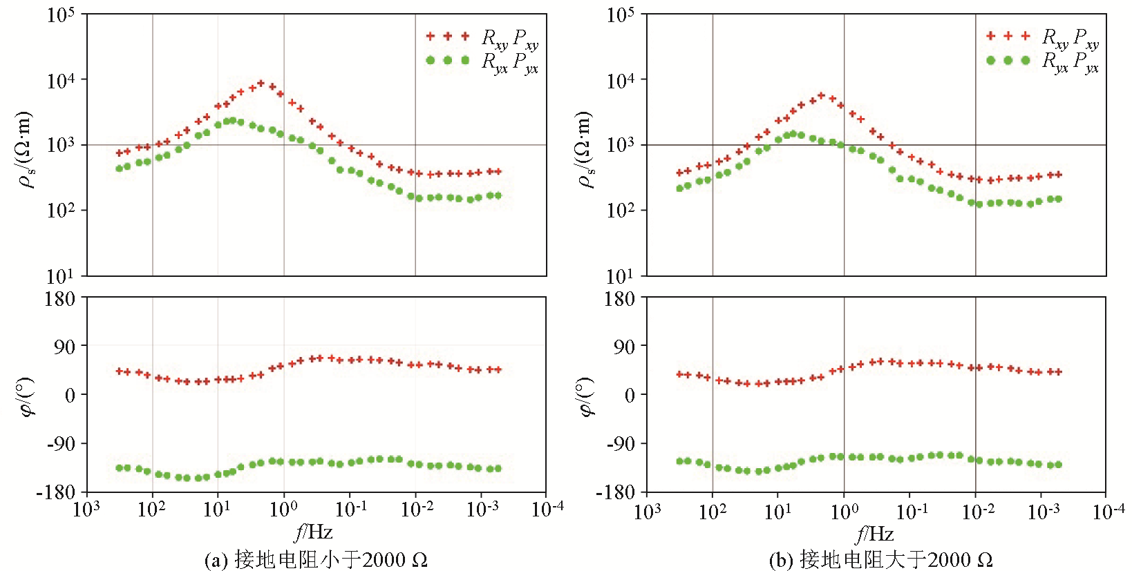 | 图9 不同接地电阻原始测量视电阻率—相位数据曲线 |