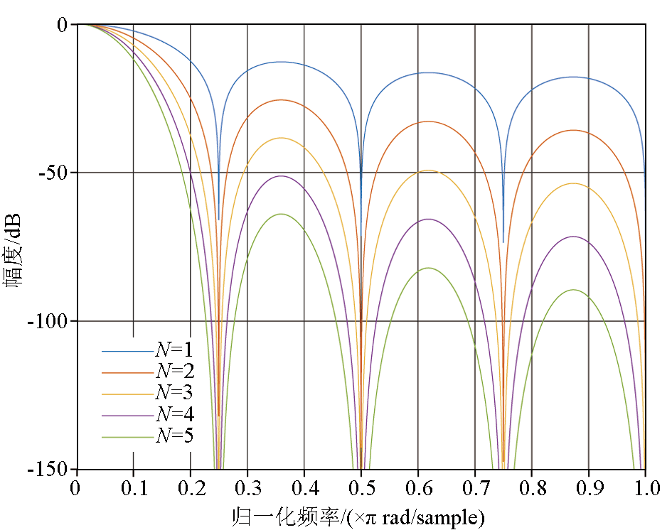 | 图7 相同抽取倍数的多级CIC滤波器归一化幅频特性 |