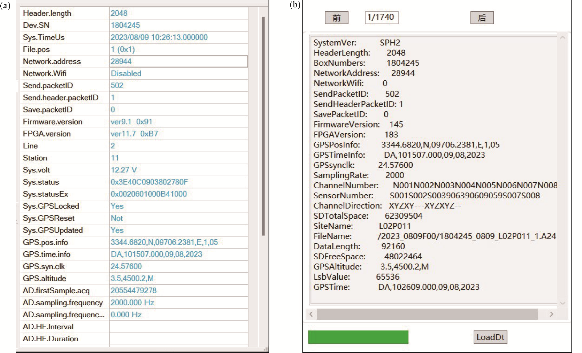 | Fig.4 Comparison of data header information of L02P011 using prMT module (a) and DataWindow module (b) |