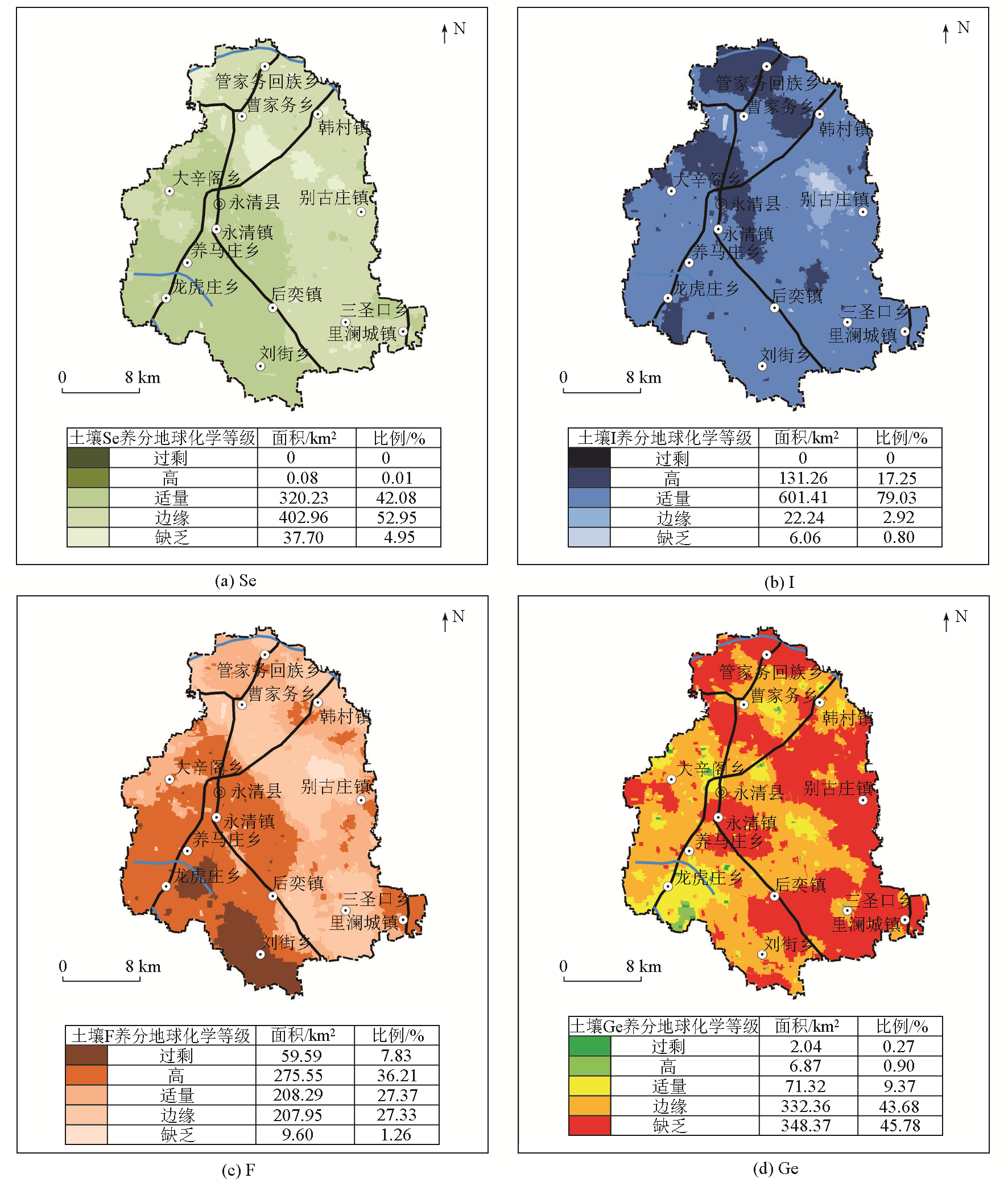 | 图4 永清县表层土壤中硒(a)、碘(b)、氟(c)、锗(d)地球化学等级 |