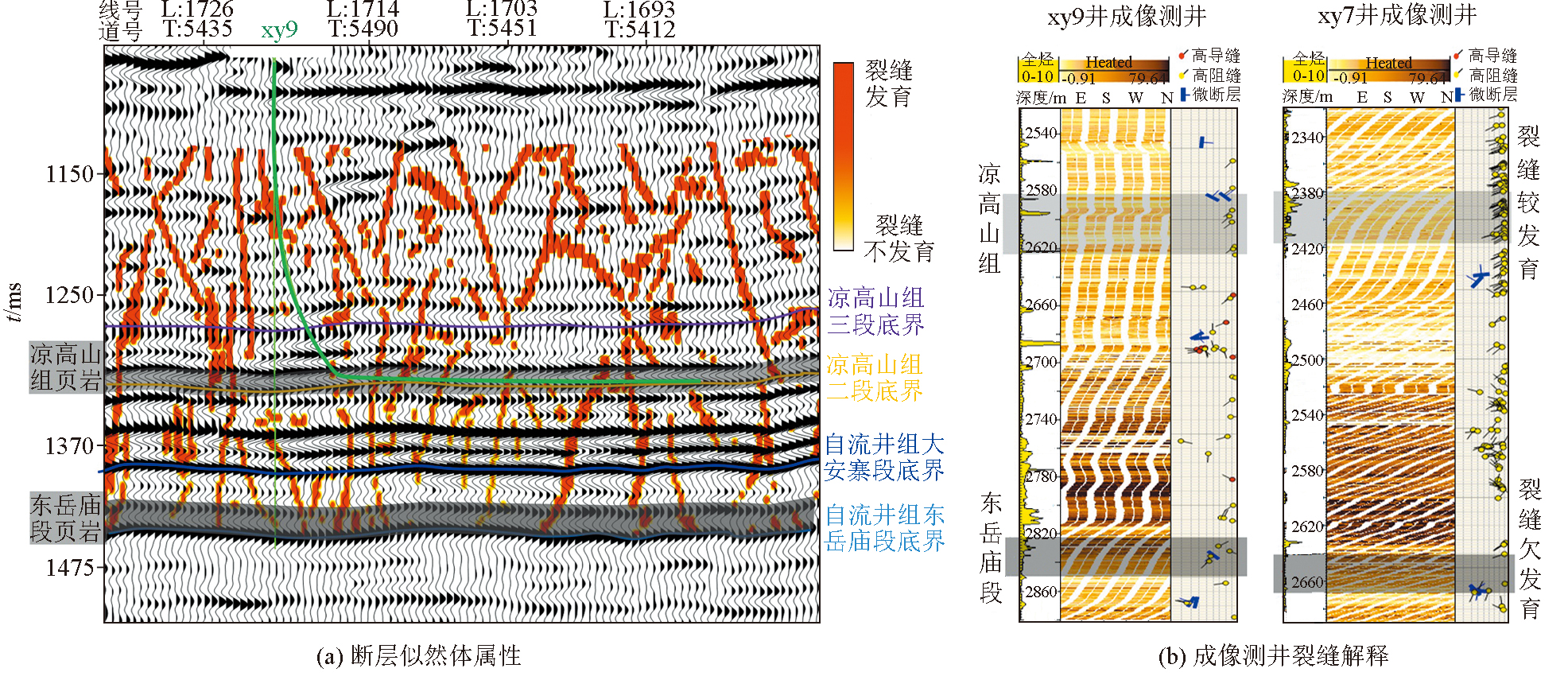 | 图7 凉高山组与东岳庙段地震属性与成像测井图像 |