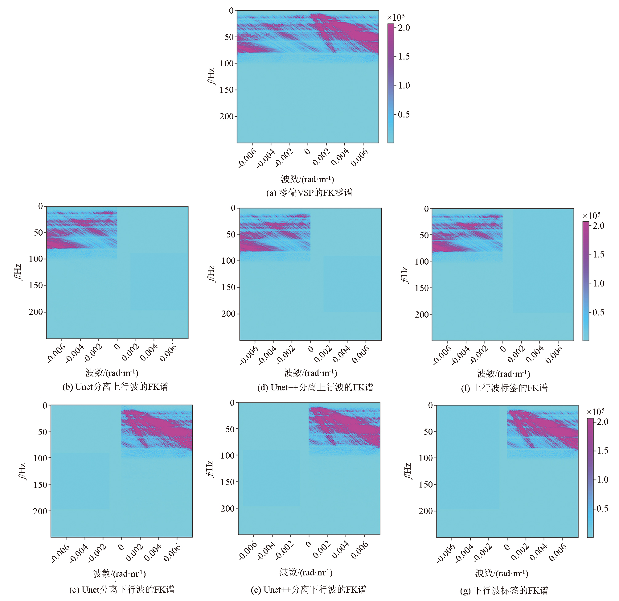 | Fig.13 FK spectra of wave field separation results of different deep learning models |