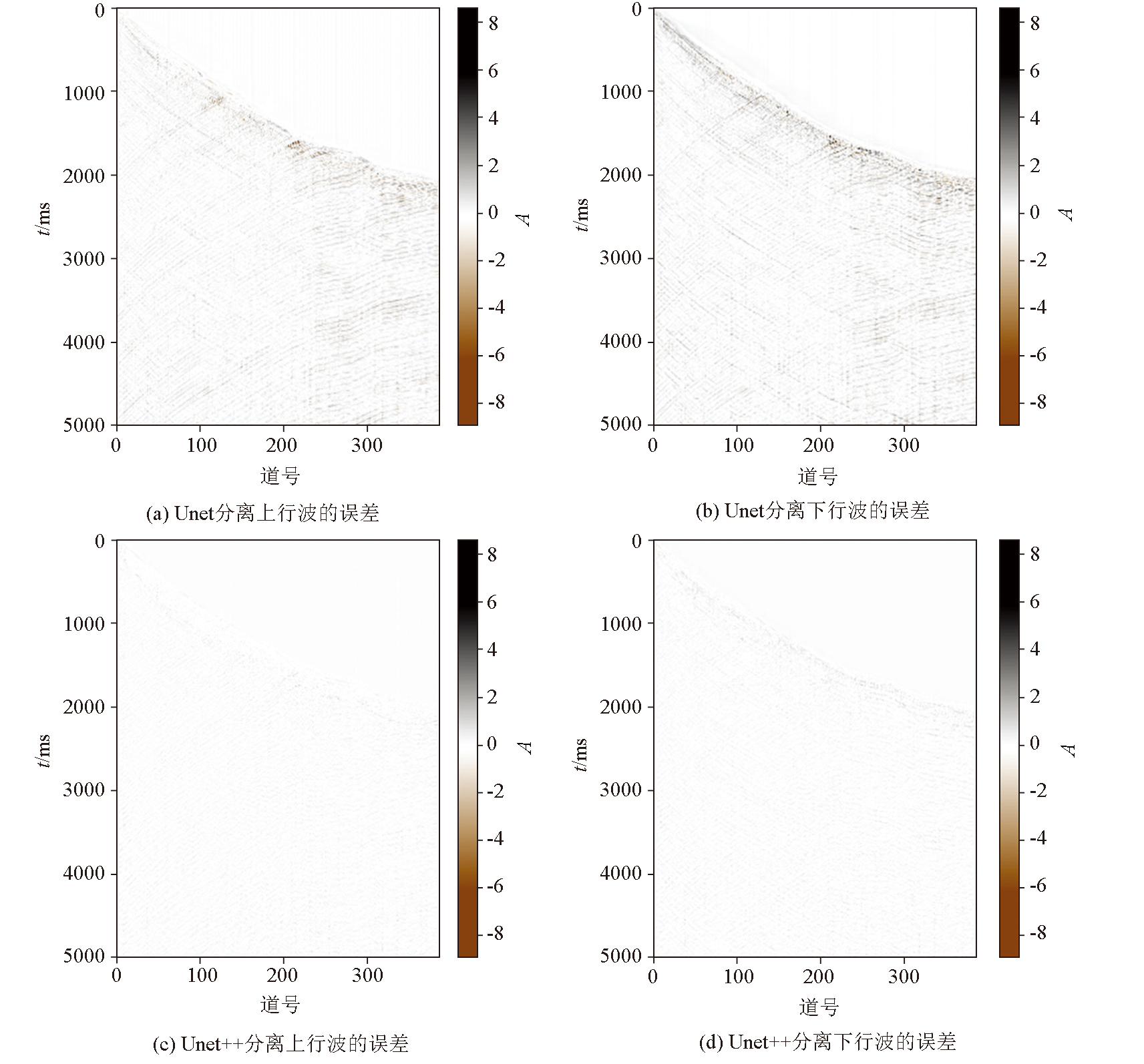 | 图14 不同深度学习模型波场分离结果与标签的残差对比 |