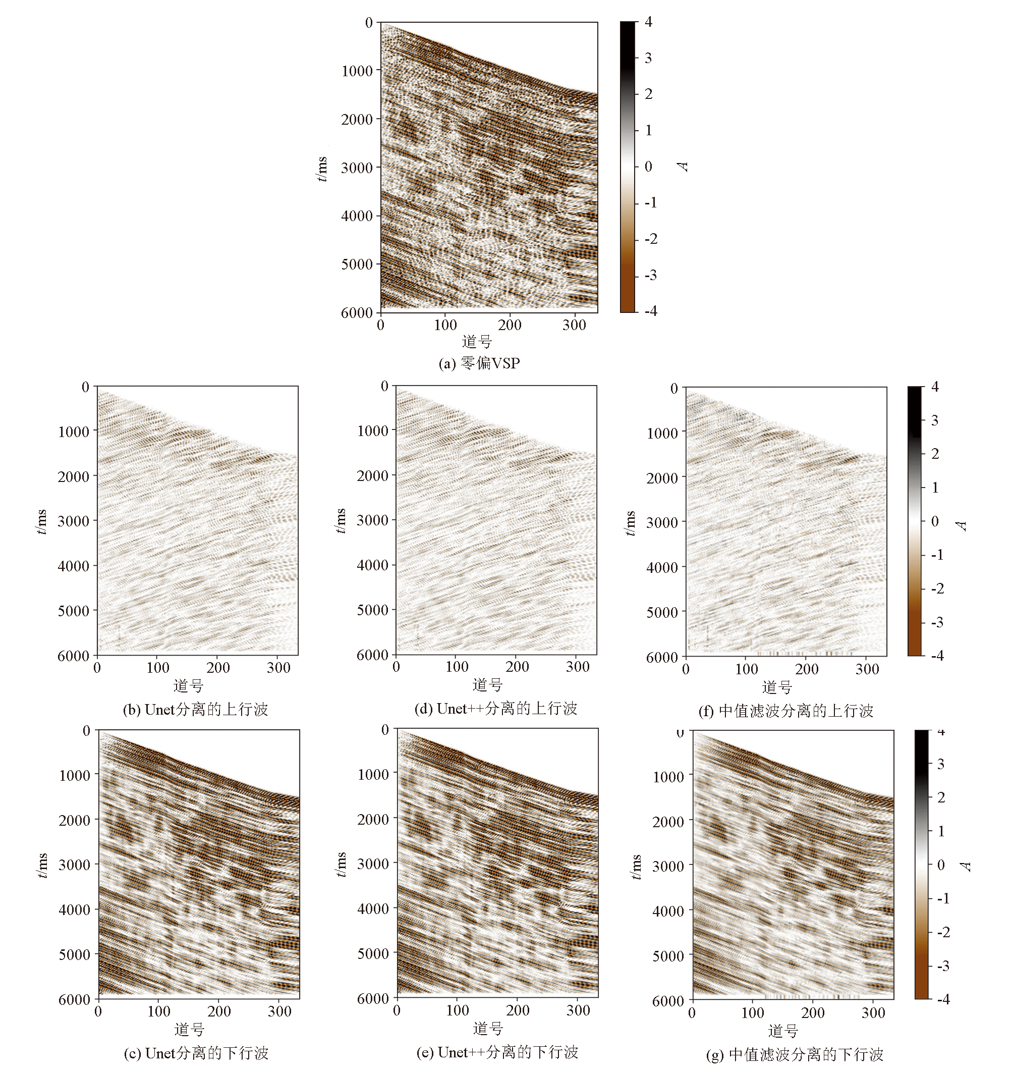 | Fig.15 Comparison of wavefield separation results for zero-offset VSP data in A-w4 using different deep learning models |