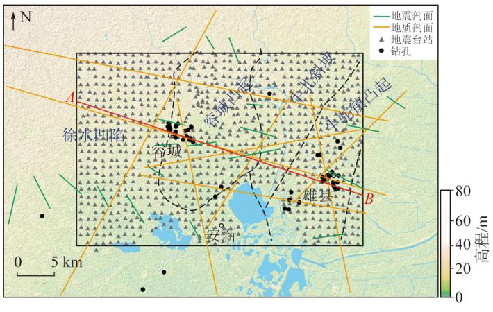 | 图2 研究区数据资料分布 黑色矩形为雄安核心区域,AB红色线段为图切剖面位置 |