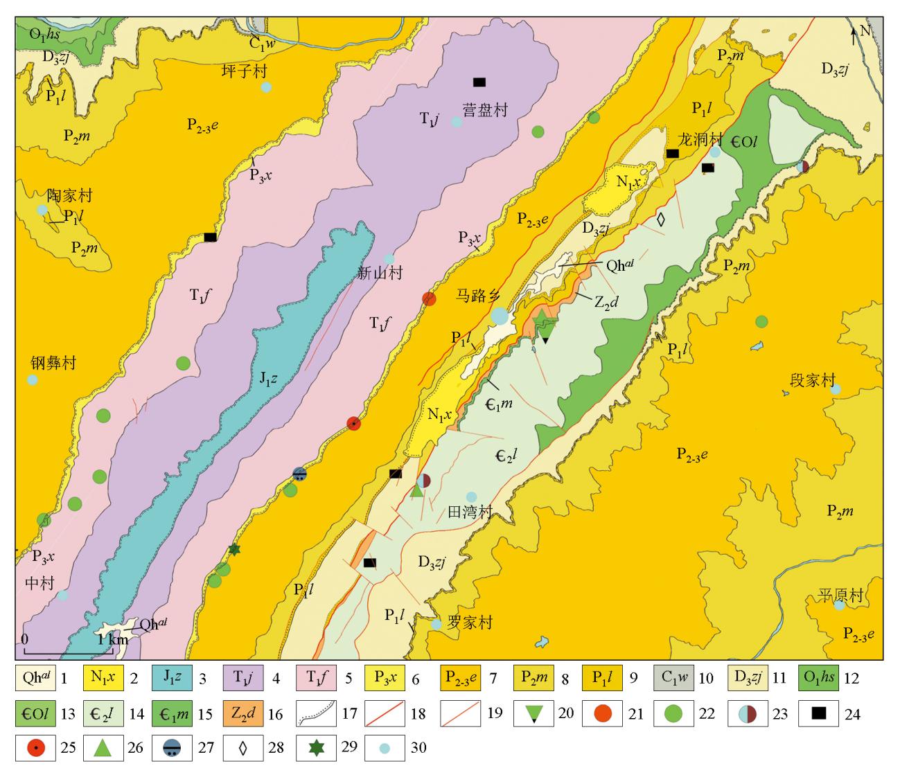 | Fig.1 Geological sketch map of the Fanshen Village area 1—Holocene; 2—Xiaolongtan Formation; 3—Ziliujing Formation; 4—Jialingjiang Formation; 5—Feixianguan Formation; 6—Xuanwei Formation; 7—Emeishan basalt Formation; 8—Maokou Formation; 9—Liangshan Formation; 10—Wanshoushan Formation; 11—Zaijieshan Formation; 12—Hongshiya Formation; 13—Loushanguan Formation; 14—Longwangmiao Formation; 15—Meishucun Formation; 16—Dengying Formation; 17—measured unconformity boundary; 18—main fault; 19—measured fault of unknown nature; 20—phosphate deposit; 21—copper mineralization point; 22—lead-zinc mineralization point; 23—bauxite mineralization point; 24—anthracite mineralization point; 25—hematite mineralization point; 26—barite mineralization point; 27—rare earth mineralization point; 28—calcite mineralization point; 29—agate mineralization point; 30—place name |