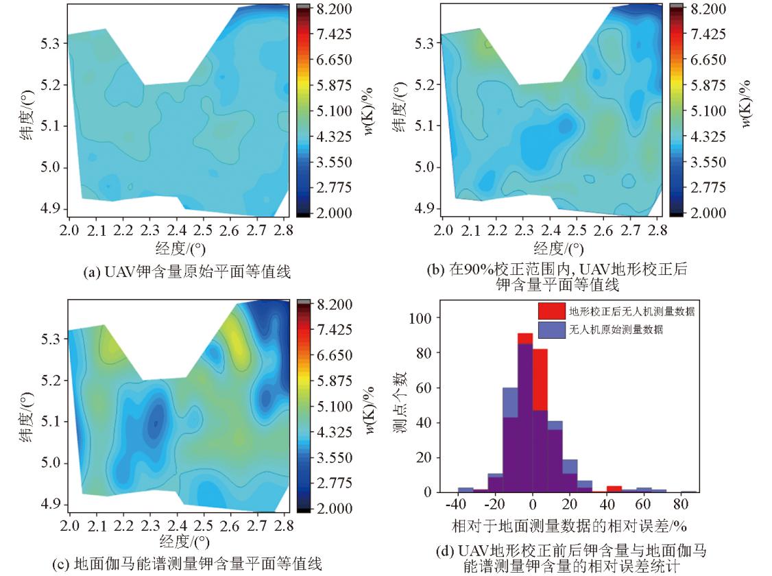 | 图10 钾元素的UAV元素含量原始平面等值线、地形校正后元素含量平面等值线、地面伽马能谱测量元素含量平面等值线,及其UAV经地形校正前后元素含量与90%校正范围内地面伽马能谱测量加权平均元素含量的相对误差分布 |