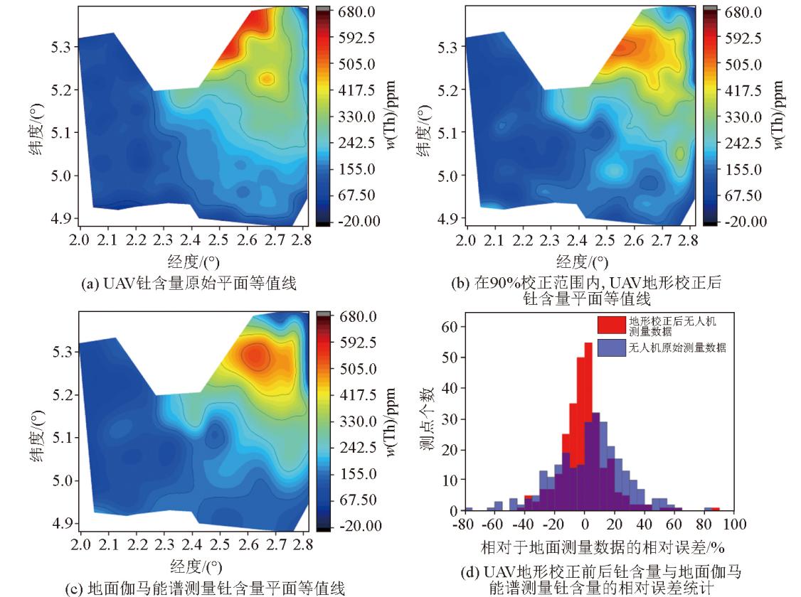 | 图9 钍元素的UAV元素含量原始平面等值线、地形校正后元素含量平面等值线、地面伽马能谱测量元素含量平面等值线,及其UAV经地形校正前后元素含量与90%校正范围内地面伽马能谱测量加权平均元素含量的相对误差分布 |