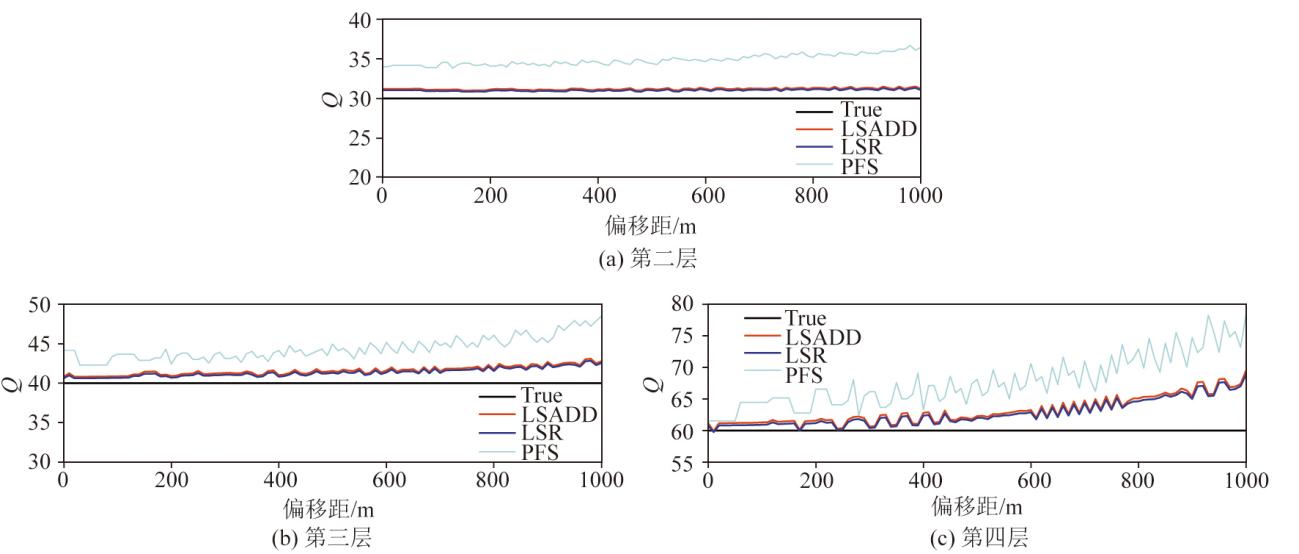 | Fig.6 Variation curves of Q values with offset estimated by different methods(LSADD, LSR, and PFS) for different layers |