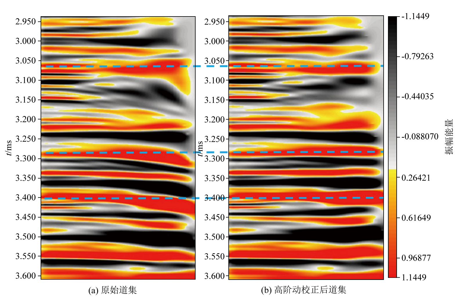 | Fig.6 Comparison of seismic gather before and after applying non-hypobolic moveout correction |