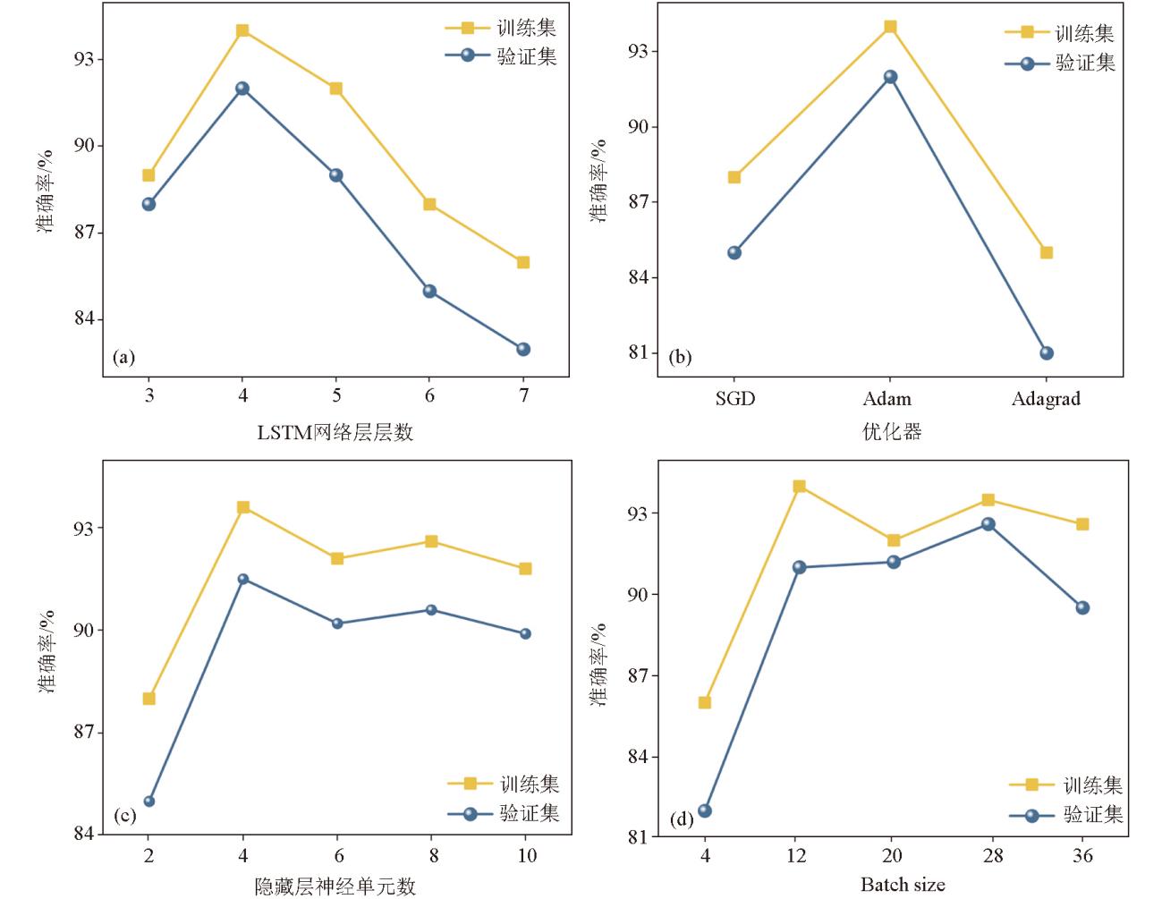| 图3 SMOTE-LSTM模型训练集、验证集准确率随(a)LSTM网络层层数、(b)优化器种类、(c)隐藏层神经单元数、(d)Batch size参数变化趋势 |