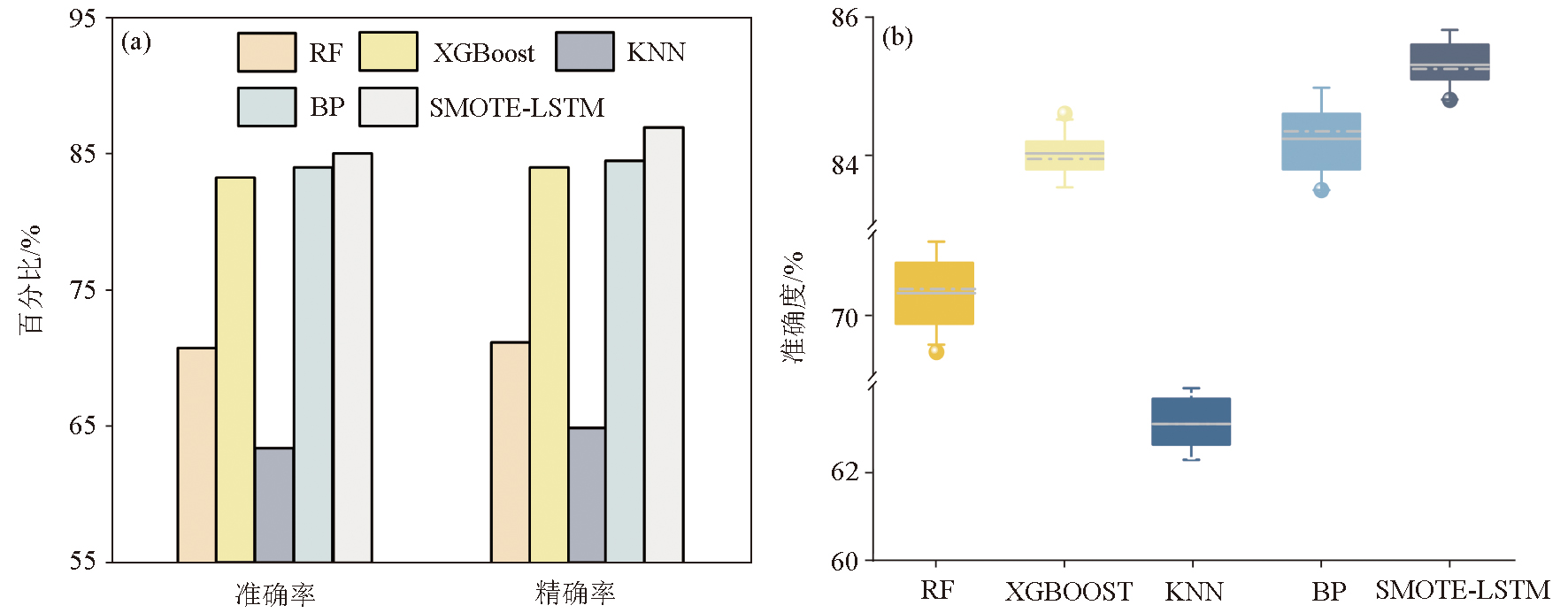 | 图6 岩性识别算法模型准确率、精确率对比(a)和对比模型十折交叉验证结果(b) |