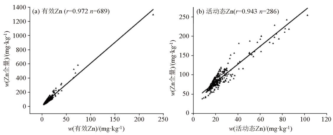 | 图4 江苏丁蜀镇土壤有效Zn、活动态Zn与土壤Zn全量散点分布及相关系数 |