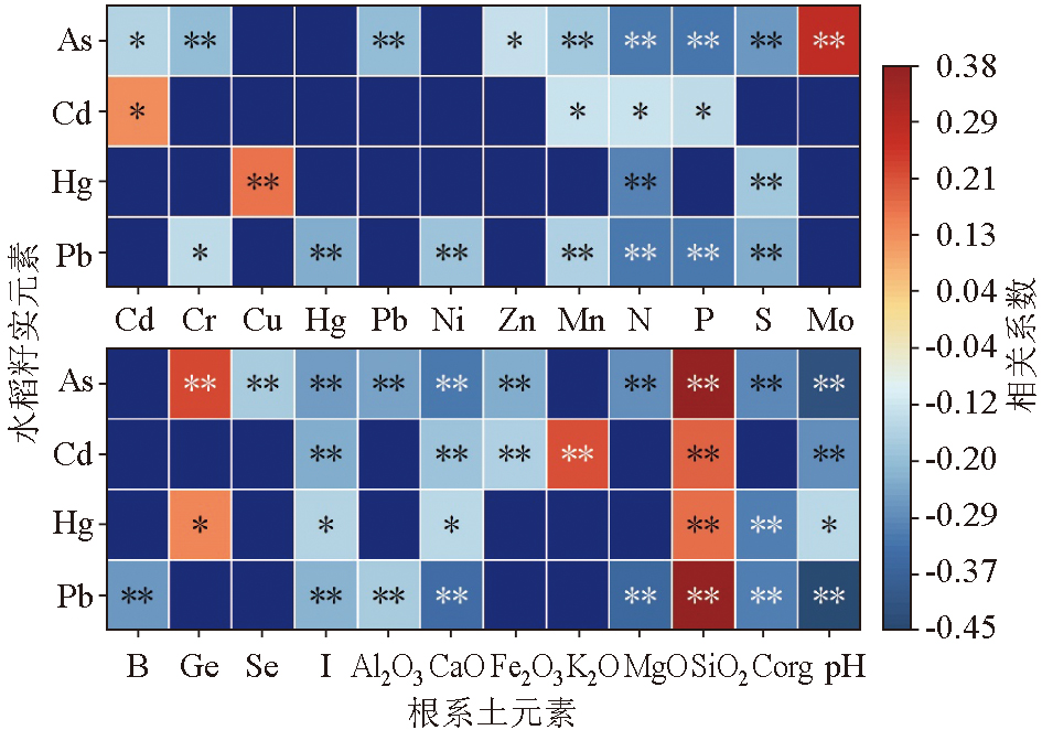 | 图3 水稻与根系土元素相关热图(N=242) 注:“*”表示在 0.05 级别相关性显著;“**”表示在 0.01 级别相关性显著 |